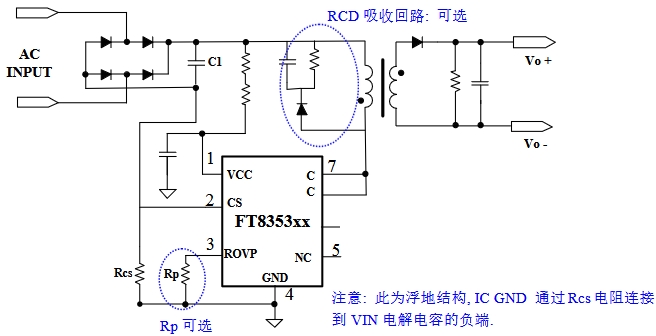 在該電路中,AC輸入電壓經(jīng)過(guò)整流濾波后,為FT8353xx芯片供電。VCC腳接收供電電壓,CS腳通過(guò)Rcs電阻采樣電感電流,實(shí)現(xiàn)恒流控制。ROVP腳根據(jù)需要設(shè)置輸出過(guò)壓保護(hù)。GND腳連接到VIN電解電容負(fù)端,為芯片提供穩(wěn)定的參考地。C腳與變壓器相連,將功率傳輸?shù)酱渭?jí)側(cè),為L(zhǎng)ED負(fù)載提供驅(qū)動(dòng)電壓和電流。此外,電路中還可選配RCD吸收回路,用于抑制變壓器漏感引起的電壓尖峰,保護(hù)芯片和電路的穩(wěn)定運(yùn)行。