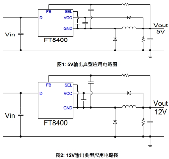 下圖展示了FT8400在5V和12V輸出時的典型應用電路圖。該電路圖展示了如何通過SEL腳懸空來設定5V輸出,并連接了必要的外圍元件,如輸入電容、輸出電容和反饋電阻等。