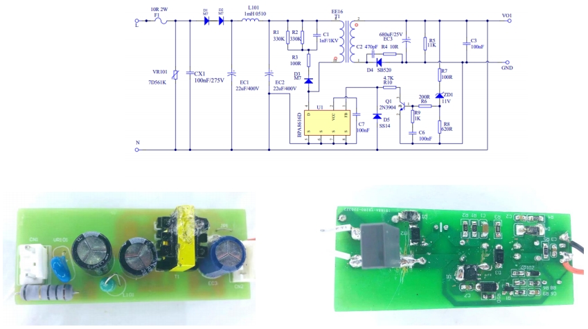 實物圖展示了該電源的整體布局和元件分布。從實物圖中可以看出,電路板采用單面板設計,元件布局緊湊合理,便于散熱和維修。輸入端和輸出端分別通過引腳連接,方便與外部設備連接。