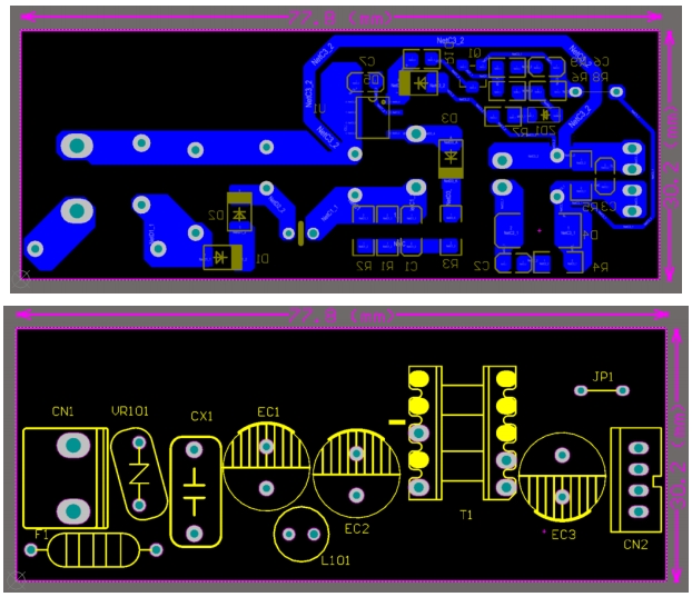 PCB設計是電源性能的重要保障。在本設計中,PCB采用CEM-1單面板,尺寸為77.8mm×30.2mm。在布局上,輸入端和輸出端盡量遠離,以減少干擾。高頻元件如變壓器、MOSFET等盡量靠近電源芯片,以縮短走線長度,降低寄生參數的影響。同時,合理安排地線和電源線的布局,確保電源的穩定性和可靠性。