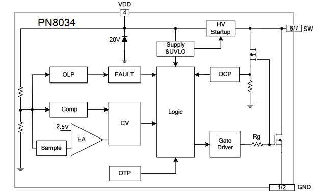 PN8034內置高壓啟動模塊,能夠實現系統(tǒng)快速啟動和超低待機功耗,待機功耗低于100mW。