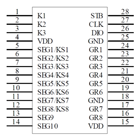 MCU數(shù)字接口:包括CLK(時鐘輸入)、DIO(數(shù)據(jù)輸入/輸出)、STB(片選)等引腳,用于與微控制器進(jìn)行通信。