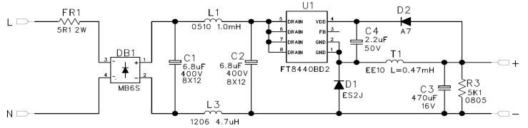 該電路原理圖中,FT8440BD2作為核心芯片,通過合理的元件布局和連接,實現了高精度恒壓輸出。電路中包括了輸入整流橋、濾波電容、高壓啟動電阻、反饋網絡、續流二極管、電感等關鍵元件,這些元件協同工作,確保電源的穩定運行。