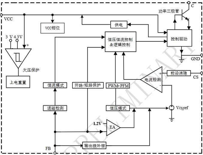 芯片通過(guò)檢測(cè)變壓器原邊的電流和電壓實(shí)現(xiàn)恒流和恒壓功能,能夠提供高精度的輸出控制。同時(shí),其內(nèi)置的輸出線損補(bǔ)償技術(shù)可以有效補(bǔ)償輸出電流在輸出線上的損耗壓降,進(jìn)一步提高輸出精度。