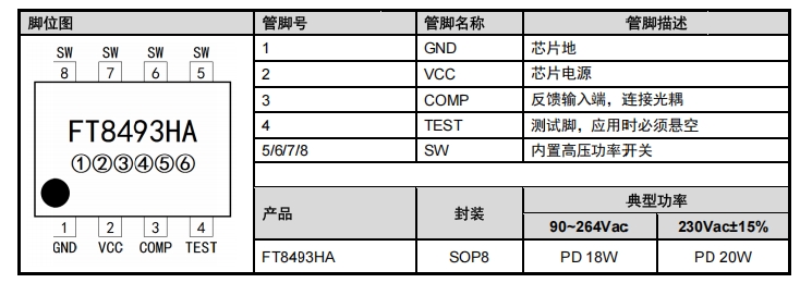 FT8493HA采用SOP8封裝,各管腳功能如下表所示: