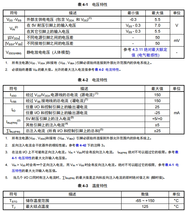 表4-1列出了電壓特性,表4-2列出了電流特性,表4-3列出了溫度特性。這些數據對于確保器件在安全范圍內工作至關重要。