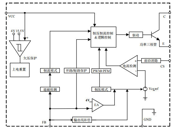 芯片通過檢測輔助繞組電壓(FB腳)實現恒壓控制,通過檢測CS腳電壓實現恒流控制。系統工作在斷續模式(DCM),利用退磁檢測實現谷底開通,提升效率。