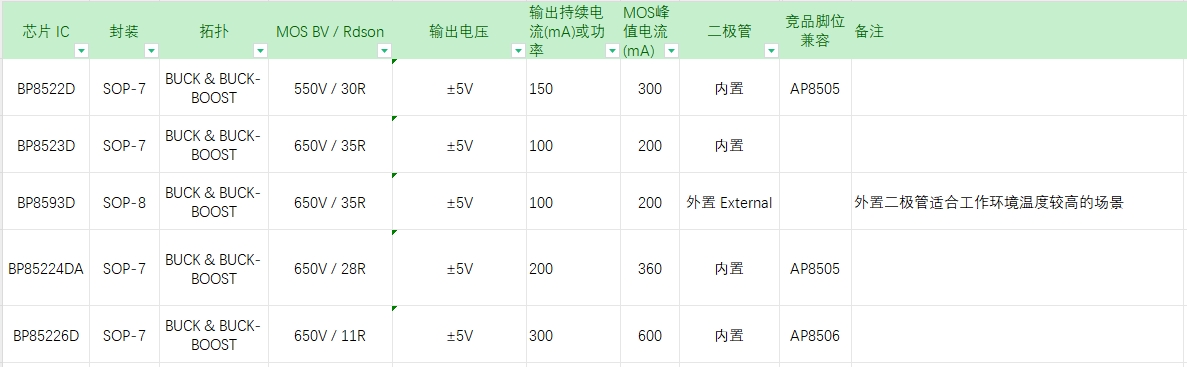 BP85224DA:采用SOP-7封裝,MOS BV/Rdson為650V/28R,輸出電壓為±5V,輸出持續電流200mA,MOS峰值電流360mA,內置二極管,兼容AP8505。