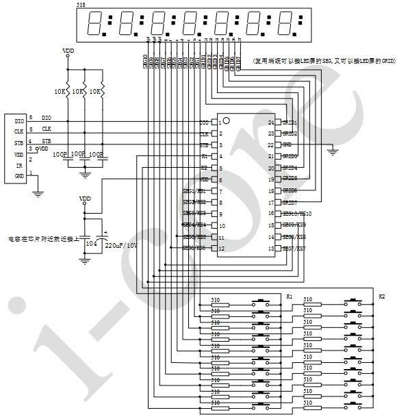 數據傳輸:通過DIO、STB和CLK三條線實現與外部控制器的數據傳輸。DIO線上的數據在STB線的上升沿被鎖存,CLK線提供時鐘信號控制數據的傳輸節奏。